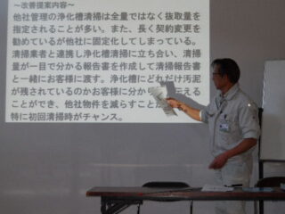 2026年3月2日 / 最終更新日時 : 2026年3月2日 admin お知らせ 2月28日に管理士勉強会を実施しました。 今月末の浄化槽管理士勉強会は、先月行った営業車両及び水物籠と使用工具の工夫と使用状況の確認と、浄化槽維持管理に関する30例の改善提案を受けての具体的な進め方の確認を行いました。 営業車輌及び水物籠と使用工具の工夫と使用状況については、社員間で良いと選ばれた7例を本人に解説してもらいました。 また、改善提案のうち7例をピックアップして社員間で現場で実際に使用する様に使い方などを提案者がレクチャーしました。